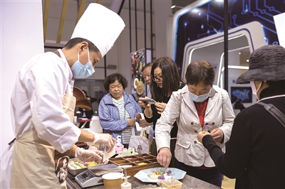 5月13日,观众在中华老字号“乔家栅”展位品尝试吃现场制作的糕点。正在上海举办的中国品牌博览会上,来自全国各地的优质老字号品牌企业齐聚一堂,通过现场展销、试吃品尝、直播带货等形式,展示优质产品。(新华)