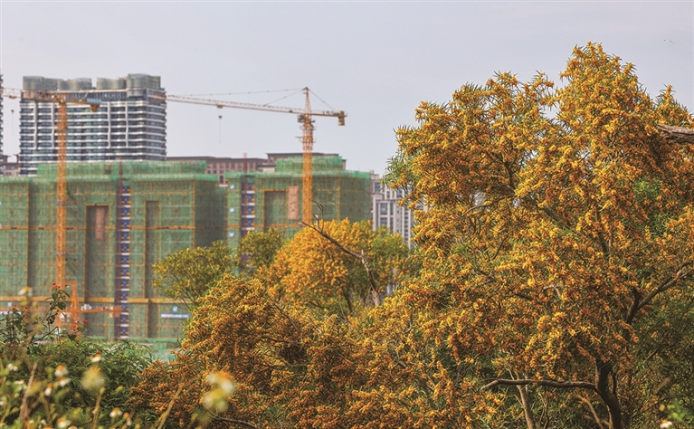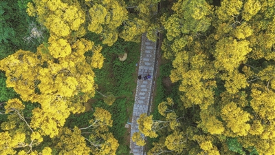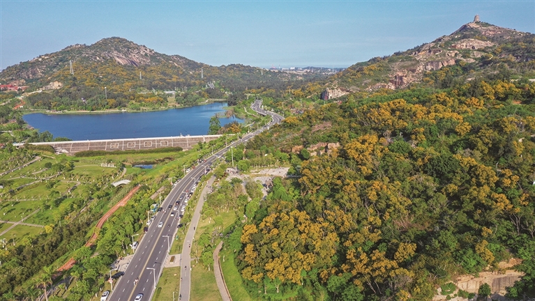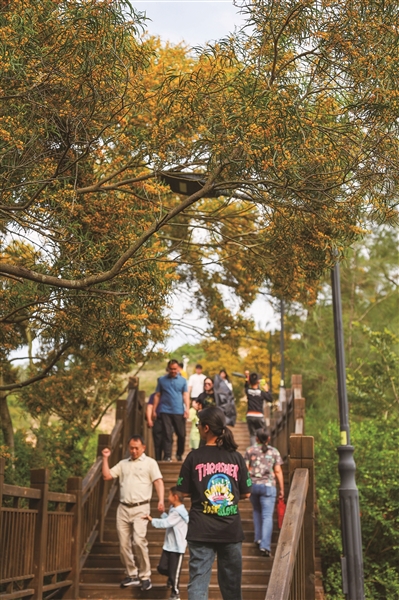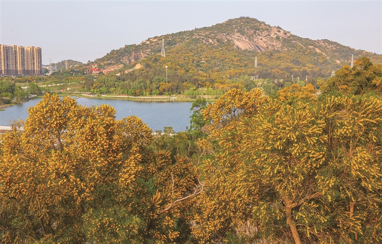 山道弯弯,步步登高。透过那一片片黄灿灿的相思树,我们看到的是曲径通幽,是游人漫步,是欢声笑语。在那相思树花纷飞的山道里独自徜徉,虽然寂寞,并不孤单,在芳香中与自然沟通,与自己内心交谈,充分享受“五一”假期这份难得的休闲时光。登上山顶,俯瞰全城。望着山下繁花似锦,犹如一幅天然画卷,让人流连忘返。