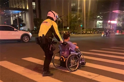 本报讯 5月12日晚8时40分左右,石狮交警大队铁骑队员陈圣寅、施心耀在路面执勤时,将一位坐着轮椅的残疾人送到安全区域,暖心之举传递了社会正能量,赢得群众点赞。
