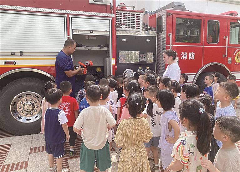 6月26日,万祥实验幼儿园联合鸿山消防救援站举行一场别开生面的消防应急拉练活动。活动中,鸿山消防救援站副队长吴晓彬为老师们作消防知识培训;孩子们认真听消防员叔叔讲解消防车和消防装备的奥秘。紧急疏散演练环节,师生们迅速而有序疏散,消防队员携带灭火装备迅速集结,对初起火灾高效扑救。(记者 郭雅霞 通讯员 陈晓鑫)