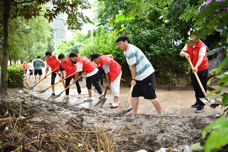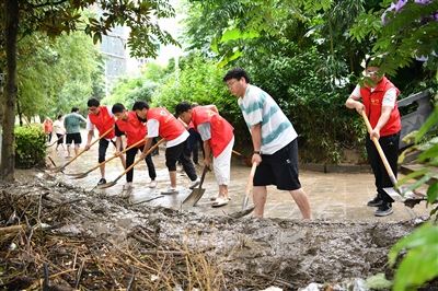 6月30日,志愿者和群众在贵州省黔东南苗族侗族自治州黄平县城区进行清淤工作。受强降雨影响,贵州、湖南部分地区出现洪涝灾害,受灾地区积极组织力量进行灾后重建工作,推动生产生活秩序逐步恢复。(新华)
