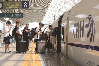 7月1日,在铁路徐州东站,旅客在站台有序上下车。当日,为期62天的2024年全国铁路暑期运输启动。7月1日至8月31日,全国铁路预计发送旅客8.6亿人次,日均发送旅客1387万人次。(新华)