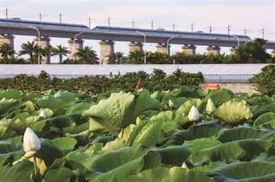 石狮湿地公园内大片的荷花已经盛开,满目绿意令人心旷神怡。一列高铁从远处的大桥上驰过,不经意间出现在取景框里,上演了一场荷花与高铁的浪漫邂逅。(记者 颜华杰)