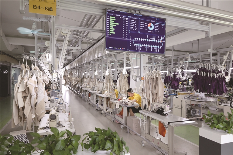 早在2019年,卡宾服饰(中国)有限公司就开始全力推进智能化建设。推广可视化数字工具、改造7个智能车间、打造20条智能化生产流水线……如今,被“爆改”的生产车间里,吊挂系统自由穿梭于整栋楼宇,各楼层的工人只需在工位上坐等吊挂“投喂”服装部件,并进行缝制、熨烫和包装即可。而在“云端系统”,还有一个无形的“IE工人”在“排兵布阵”,它会事先模拟生产流程,并根据工人的技能水平分配各道工序,以求生产效率达到“最佳效果”。