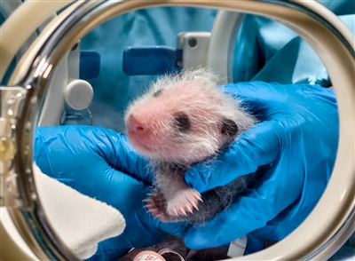 7月2日,工作人员为广州长隆大熊猫三胞胎“萌萌”产下的幼仔测量胸径体长。 10年前,全球唯一的大熊猫三胞胎在广州长隆诞生。今年6月18日,三胞胎中的大姐“萌萌”顺利产下一胎雌性幼仔。目前大熊猫宝宝体重已由出生时的178克增加至462克,粉色皮肤上长出了白色绒毛,眼圈、耳朵、肩带、前后肢都已经开始逐渐变黑。(新华)