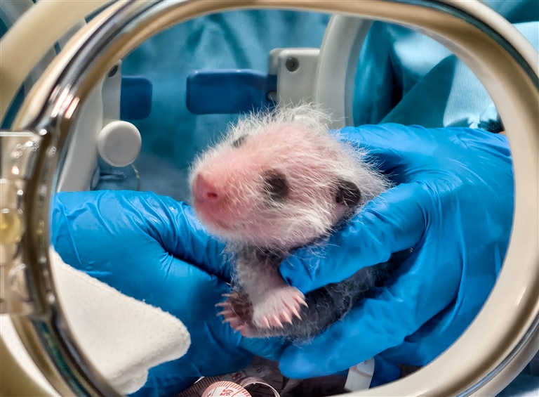 7月2日,工作人员为广州长隆大熊猫三胞胎“萌萌”产下的幼仔测量胸径体长。