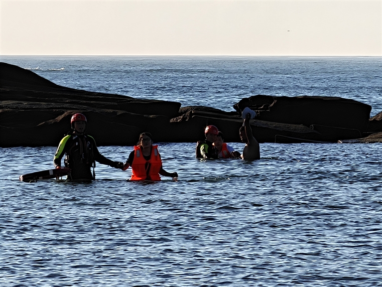 到达现场后,消防员发现,一男一女被困在离岸约150米的礁石处,此时正值涨潮,海水慢慢涌了上来。了解现场情况后,消防员穿戴好个人防护装备,带上救生装备,绑上漂浮绳,涉水前行到礁石处,岸上消防员拉好漂浮绳进行配合。经过15分钟的营救,成功将2名游客营救上岸。