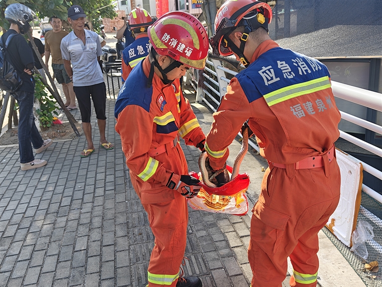 本报讯 7月2日16时34分许,石狮永宁消防救援站接到群众报警称:永宁镇外高村海域,有一条1.5米左右的蛇卡在渔网中,需要消防帮忙抓捕。接到报警后,永宁消防站立即出动1车6人赶赴现场处置。