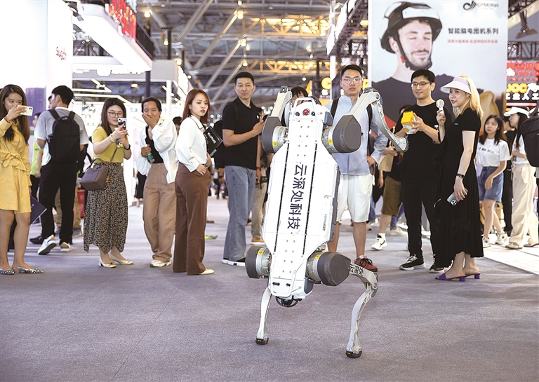 7月4日,人们在2024世界人工智能大会上观看机器狗倒立表演。当日,2024世界人工智能大会暨人工智能全球治理高级别会议在上海开幕。本届大会的主题是“以共商促共享 以善治促善智”,主要包含会议论坛、展览展示、评奖赛事、智能体验4个板块,涵盖AI伦理治理、大模型、数据、算力、科学智能、新型工业化、自动驾驶、投融资、教育与人才等重点议题,全面体现AI向善、国际合作、共治共享的价值导向。(新华)