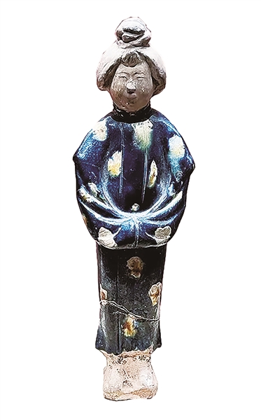 唐代蓝衫女立俑的珍贵之处在于长袍上施饰蓝色钴釉后,呈深蓝彩地,遍洒白花团,花团中又略具淡棕色,色泽鲜亮明艳,成为众多色釉之中的点睛之色。蓝釉含有其他唐三彩中没有的氧化锑和氧化钴两种新的成分,氧化钴由西亚经丝绸之路传入大唐,非常稀少,只用于高档的三彩器上,因而蓝釉在早期唐三彩中极为罕见,且使用者绝大多数为王公贵族阶层,这也是唐三彩中蓝釉器物价值远高于其他釉色三彩器的原因所在。安元寿墓出土的蓝彩女立俑,不仅制作年代较早,而且以亭亭玉立的神韵和稀有的蓝彩,富于鲜明的时代气息,成为唐三彩中的佼佼者。