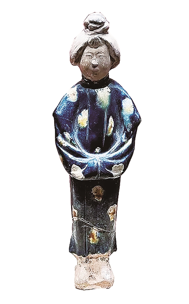 这件唐三彩女立俑高22.5厘米,1972年出土于陕西礼泉县昭陵陵园内的安元寿墓,是昭陵已发掘的30余座陪葬墓中仅有的一件蓝釉三彩俑。女立俑头梳单螺高髻,面庞丰润,墨描眉目,双眼微眯,朱红点唇,神情端庄优雅;身穿蓝地白花半高小领长袍,窄袖束腰,衣褶纹路清晰流畅;双手交于腹前,双脚并拢,体态丰腴,婉约华贵,气韵生动,俨然一位典雅的贵妇人。特别是其蓝彩,在早期唐三彩中极为罕见。