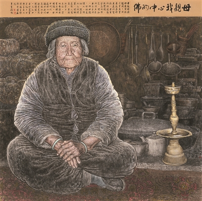 母爱是天下第一情、天下第一爱!王有政用画笔来描述她、颂扬她,在作品题记写道:年轻时我那么匆忙离开了你,千里万里去追寻那天边的圣迹,半生的旅程教我觉悟,金色的佛光、无私的净土,原出自于你。啊!母亲,哪怕是伟人、领袖、骁勇的元帅将军,无论是哲人、智者、普通的劳工、商旅,恐怕都跟我有同样的体验。世世代代,这样的母亲把我们民族的全部历史默默谱写。
