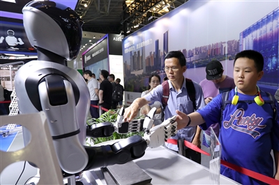 7月5日,参观者在触摸感受机器人的仿生机械手。