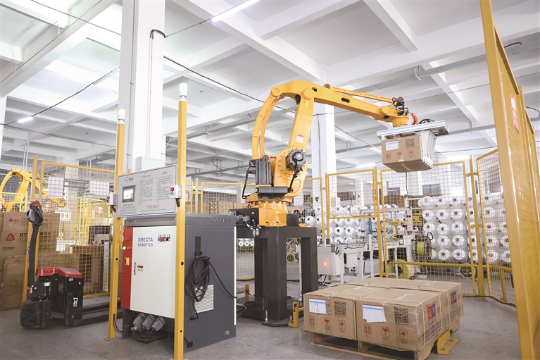 本报讯 随着科技的不断发展,机器人智能化运作在我市各个行业中的应用越来越广泛。近年来,石狮新远辉化纤纺织科技有限公司通过引进先进的生产智能设备,提升了生产效率,降低了人工生产成本。在新远辉的涤纶丝包装车间,只见两台智能码垛机器人正来回运转,生产好的化纤产品经过自动包装线后自动包装、自动打包,随后机器人自动码垛成型,全程无需人工干预。机器人还配备了高精度的传感器和先进的图像识别技术,能够准确识别货物的位置和姿态,确保码垛的整齐度和稳定性。据该公司负责人介绍,企业引进智能设备后,减少了人力成本和错误率,工作效率是人工的3倍以上,单岗位用工数量减少20%,单位面积产出效率提升30%以上。