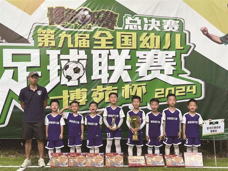 本报讯 刚刚在北京结束的全国第九届“博苑杯”幼儿足球联赛总决赛中,石狮市新苗足球队与全国各地区域赛冠亚军队角逐,经6场比赛取得了5胜1平的成绩,最后以点球憾负,荣膺全国幼儿足球总决赛亚军。据了解,在此前的武汉区域赛中,石狮市新苗足球队获得冠军,并获取总决赛资格。近年来,石狮新苗教育机构多次组织幼儿参加国家级别、省市级别的校园足球交流,通过趣味化的运动,开发幼儿的身体潜能。 (记者 张军璞)