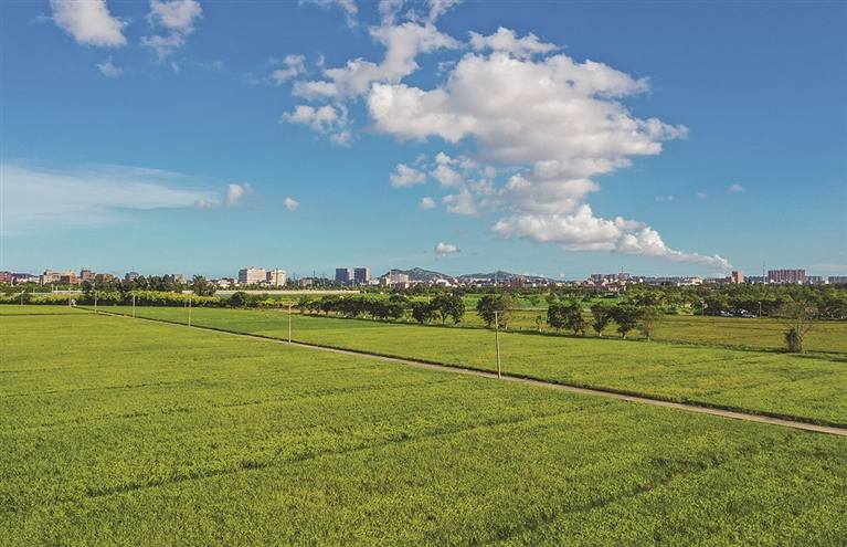 本报讯 7月3日,石狮湿地公园内的稻田里黄绿相间,微风拂过,稻浪翻滚,飘来阵阵稻香,我市水稻长势喜人,即将迎来丰收。从高空俯瞰,稻田阡陌纵横,与村落、远山、小路构成了一幅美丽的田园画卷。水稻种植户林金盾告诉记者,本月中旬他们将开始进行水稻收割。 (记者 颜华杰)