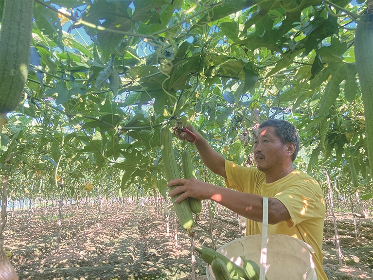 本报讯 7月4日下午,记者在湿地公园的丝瓜田里看到,种植户安世才正手持剪刀,熟练地采摘成熟的丝瓜。“丝瓜现在正是收获季,高峰期一天采收一千斤,少的话一天也有四五百斤。”安世才告诉记者,今年丝瓜的产量跟效益获得了双丰收。