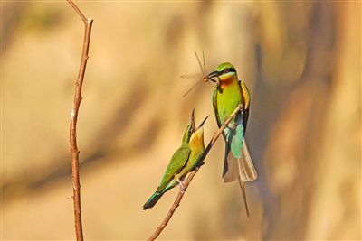 石狮峡谷旅游路,本季栗喉蜂虎已育出新鸟。图为哺育雏鸟 (杨思盾/图)