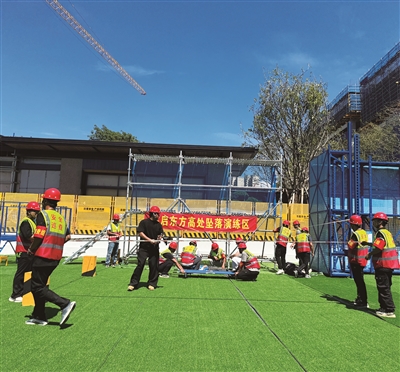此次活动也是我市建筑施工领域2025年“安全生产月”系列活动之一。现场,模拟外架搭设过程中作业人员未系安全带坠落的突发场景,举行了高处坠落安全应急演练。从险情发生到伤员获救,各救援小组高效联动、紧密衔接,构建起“黄金生命救援链”。通过实操演练,增强施工安全管理和作业人员防范生产安全风险的意识,掌握应对高处坠落事故的应急知识和处置技能,提升事故发生时的自救、互救能力。