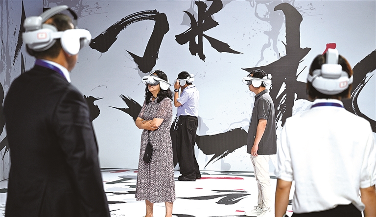 7月4日,重庆永川国际会展中心,嘉宾观看中国电影科技企业的虚拟影片。当日,2025上海合作组织国家电影节电影市场开幕式及电影科技成果展览启动活动在重庆永川国际会展中心举行。据悉,现场有来自俄罗斯、白俄罗斯、巴基斯坦等多个上合组织国家的电影机构代表通过视频推介本国电影产业,40余家国内一线电影科技企业聚焦“电影+科技”主题,集中呈现AI、虚拟拍摄、动作捕捉、数字人等前沿成果。(新华)