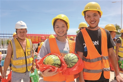 活动现场,中建海峡项目经理代表学校和项目部向战高温、斗酷暑的600多名工友表示诚挚感谢,并叮嘱大家做好防暑降温措施,高温期间合理安排作业时段,规范使用安全防护用具,确保身体健康与施工安全。随后,参加活动的有关负责人为工友们送上清凉茶、西瓜、生活用品等“清凉生活包”。