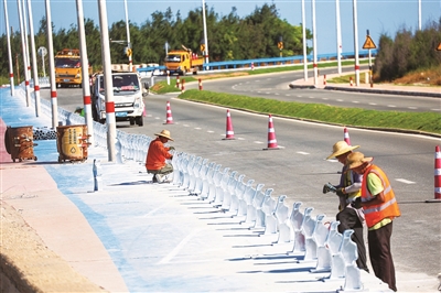6月30日,在国道G228公路哨所公园段,工人师傅们正头顶烈日进行防撞护栏安装等作业,完工后将为过往车辆和行人提供更加可靠的安全保障。(记者 颜华杰)