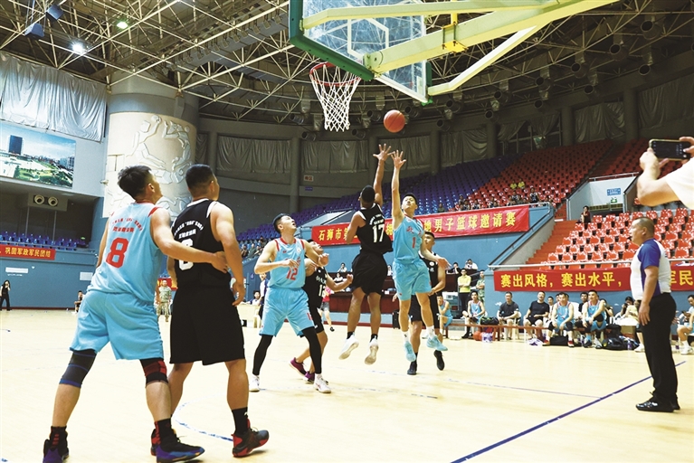7月1日晚,石狮市第五届“双拥杯”军地男子篮球邀请赛在市体育中心举行,10支军地劲旅齐聚赛场,展现团结拼搏的体育精神。(记者 郭雅霞 见习记者 张诗瑶)