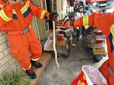 到达现场后,居民向消防救援人员介绍,他先前开门时发现有一条蛇在门口处移动,把他吓了一跳,因为不清楚是什么蛇类,他不敢上前,只得迅速将门关闭。了解情况后,消防救援人员马上开始侦查,很快在屋内一处角落发现一条一米多长的菜花蛇。两名消防救援人员立即用捕蛇器配合抓捕,顺利将蛇制住并装入事先准备好的麻袋里,随后将其带到野外区域放生。
