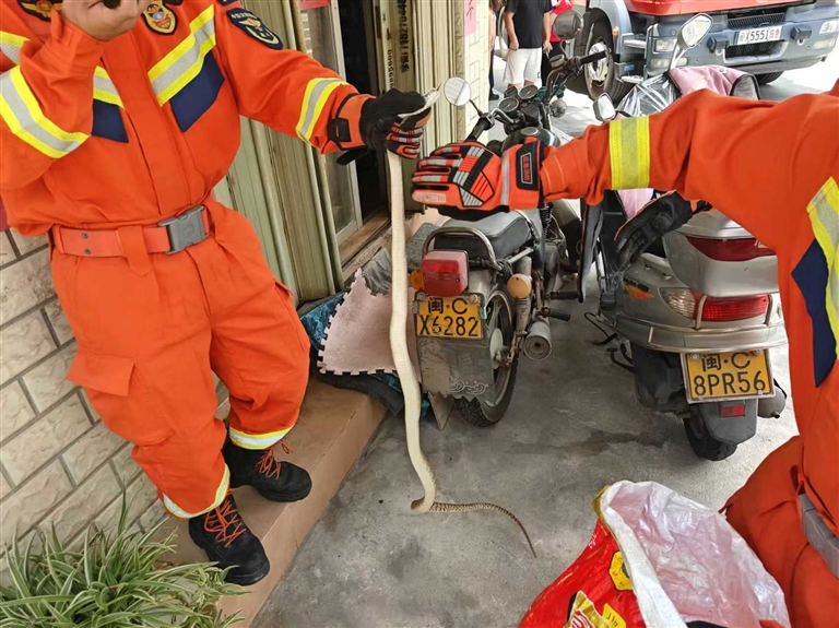 本报讯 日前,蚶江镇洪窟村一居民家中闯进一条一米多长的菜花蛇,把居民吓了一跳。接到警情后,蚶江消防救援站立即派消防救援人员到场处置。