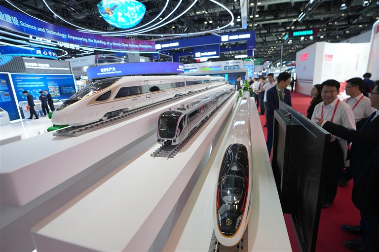 7月8日,观众在第十七届中国国际现代化铁路技术装备展览会上参观。当日,中国铁道科学研究院集团有限公司、中国国际贸易中心股份有限公司主办的第十七届中国国际现代化铁路技术装备展览会在北京开幕,集中展示世界各国先进铁路技术和装备。(新华)