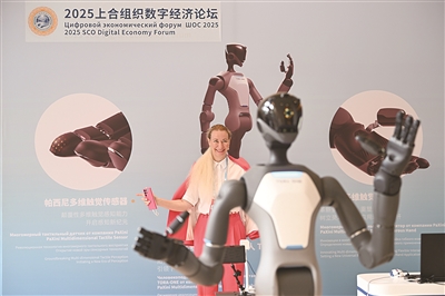 7月11日,以“数字经济新纽带 共拓合作新空间”为主题的2025上合组织数字经济论坛在天津举行。图为参会嘉宾体验操控人形机器人。(新华)