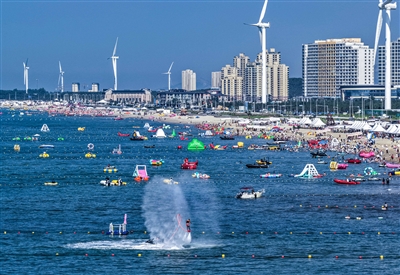 7月12日,游客在山东省荣成市那香海景区游玩(无人机照片)。连日来,全国多地持续高温,催热暑期“清凉经济”,多样化消暑体验和消费场景释放夏日经济活力。(新华)