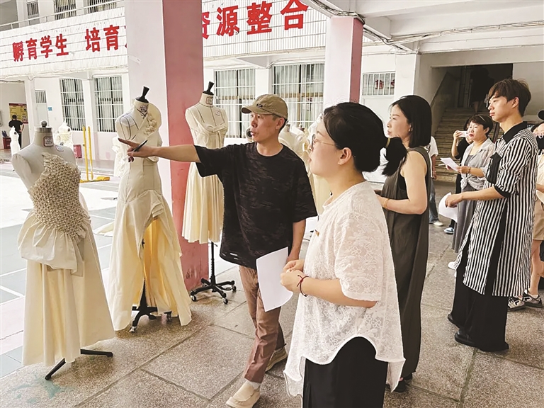 作品展示现场人气高涨,琳琅满目的闽绣创意作品吸引学校领导、教师及学生驻足参观。评委团队穿梭其间,从创意设计、工艺技巧、立体造型等维度,对每件作品进行严谨评判,并在评审结束后,针对作品优缺点提出专业建议,助力学生成长。