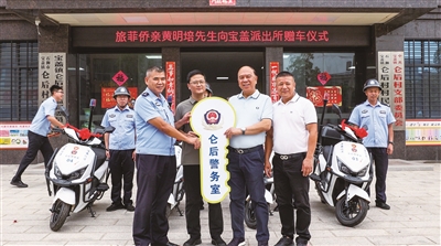 日前,黄明培回到家乡,听说警务室的巡逻车已十分老旧的情况后,他当即决定,为警务室捐赠四辆巡逻电动车。“我们虽然远居海外,但始终心系家乡,希望家乡越来越好!”黄明培说,这是每一位游子的共同心愿,“很开心能为家乡的发展出一份力!”