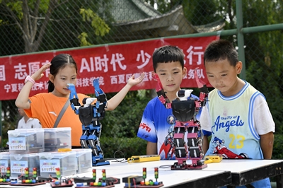 7月23日,小朋友在活动现场观看机器人表演。当日,中央宣传部和宁夏回族自治区党委、政府联合主办的2025年全国文化科技卫生“三下乡”集中示范活动在宁夏青铜峡市举行。集中示范活动当天,来自宣传、文化、科技、卫生、教育、农业、司法等方面的专家和志愿者,在青铜峡市峡口镇综合文化站广场,为当地农民群众提供了政策宣讲、文艺演出、科学普及、医疗义诊、农技推广、法律咨询等服务。他们还将走村入户,把文化产品、农业服务、法律知识等送到农民群众身边。(新华)