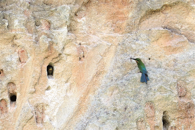 当日上午,各方实地探访栗喉蜂虎在石狮的“家”——峡谷旅游路,了解分析该区域栗喉蜂虎生态环境。今年,“中国最美小鸟”栗喉蜂虎石狮之旅进入第四季,超百只栗喉蜂虎从东南亚向北迁徙至石狮峡谷旅游路“安家产子”。进入7月,栗喉蜂虎雏鸟陆续出巢,跟随父母学习飞翔、觅食等技能,目前绝大部分雏鸟已离巢飞往周边区域,仅有个别巢穴可见栗喉蜂虎飞入洞内喂食。