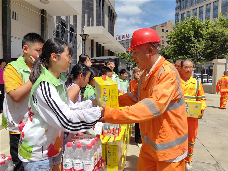 “爷爷奶奶,你们辛苦了!高温天气,要多注意防暑!”“谢谢孩子们的关心,也祝你们学习进步。”活动现场,18名中小学生组成的志愿服务队,将清凉饮品逐一递到环卫工人手中,并送上暖心的祝福。环卫工人们接过物资,脸上洋溢着朴实的笑容,现场温情涌动。
