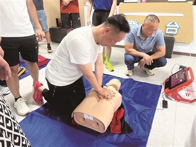 现场,80余名与会人员围坐一堂,跟着急救专家学起“救命本领”。活动伊始,急救专家带着模拟人教具走上讲台,介绍道:“心脏骤停的黄金抢救时间只有4分钟,每多一个人会心肺复苏,就多一分生的希望。”在随后的实操环节中,与会人员在急救专家指导下分步骤学习。“按压深度要5至6厘米”“要在胸前‘画十字’”“止血带绕两圈,松紧以不出血为准”,专家一边演示,一边手把手纠正大家的动作。“跑步过程中可能遇到中暑、心脏骤停等突发情况,掌握急救技能不仅能保护自己,更能帮助他人。”专家表示。