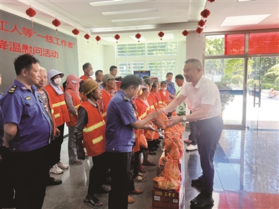 本报讯 近日,鸿山镇组织开展防暑降温慰问活动,为奋战在一线的环卫工人和综合执法队执法辅助人员送去夏日关怀,向他们发放防暑降温饮品药品,切实保障高温作业人员的身体健康。