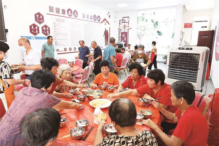 7月27日中午,烈日当空,西偏村“党建+”邻里中心一楼的长者食堂满溢着烟火气息。厨房里,工作人员与志愿者在灶台与案板间有序穿梭,铁锅翻炒腾起阵阵鲜香,一道道热菜迅速出锅。就餐区,老人们围坐一桌,你一言我一语唠着家常,热腾腾的饭菜不仅暖胃,更让欢声笑语填满了整个空间。?