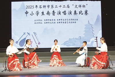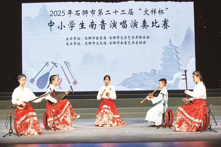 7月24日,2025年石狮市第二十二届中小学生南音演唱演奏比赛在石狮市音乐厅举行,来自全市各中小学的90名南音好手参加角逐。(记者 许小雄)
