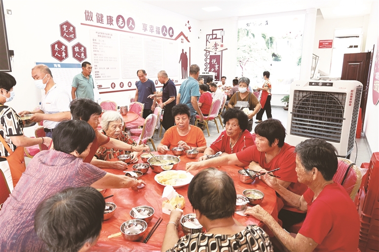 7月27日中午,烈日当空,西偏村“党建+”邻里中心一楼的长者食堂满溢着烟火气息。厨房里,工作人员与志愿者在灶台与案板间有序穿梭,铁锅翻炒腾起阵阵鲜香,一道道热菜迅速出锅。就餐区,老人们围坐一桌,你一言我一语唠着家常,热腾腾的饭菜不仅暖胃,更让欢声笑语填满了整个空间。