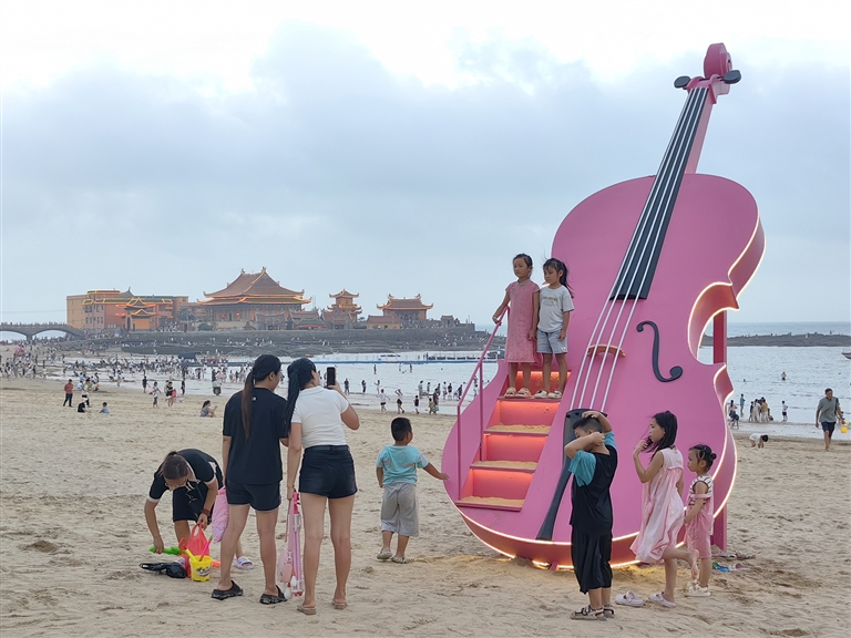 本报讯 近日,永宁黄金海岸沙滩新添一处网红打卡新地标——一座造型别致的小提琴艺术装置,其独特设计与滨海风光巧妙融合,成为游客争相打卡的新地标。