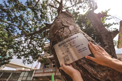 “本次除对新增的9株古树名木挂牌外,还要对此前的36株古树名木更换新牌。”市自然资源局林业资源站工作人员小潘表示。在蚶江镇水头村象峰寺前,一株约110年树龄的榕树换上了新牌,记者注意到,与旧牌相比,最明显的变化是增加了专属二维码,公众扫码即可解锁该古树的详细“档案”,包括地理位置、历史图片以及树高、胸径、冠幅等信息。