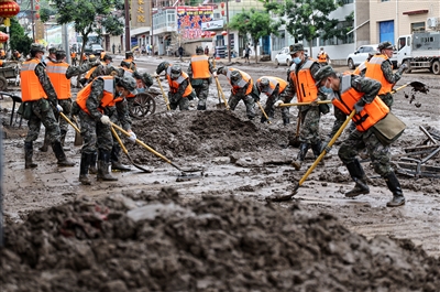 8月10日,武警甘肃总队机动支队官兵在兰州市榆中县城关镇兴隆山村清理淤泥。当日,武警甘肃总队投入400余名兵力在兰州市榆中县兴隆山村、马莲滩村、小康营村、旧庄沟村等地开展搜寻失联人员、居民区清淤、物资转移、防疫消杀等任务。(新华)
