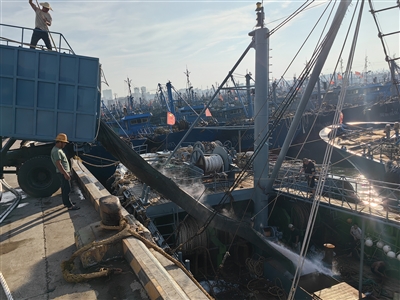 本报讯 开渔在即,休整了3个半月的渔港码头愈发热闹起来。近日,记者在祥芝国家中心渔港看到,码头上运冰车往来穿梭,为渔船仓库补充冰块;大型吊车将整修一新的渔船设备、渔具等吊装至甲板;渔船上,工人们分工协作,整理绳索、检查船体、调试设备……确保渔船各项功能设施安全达标。