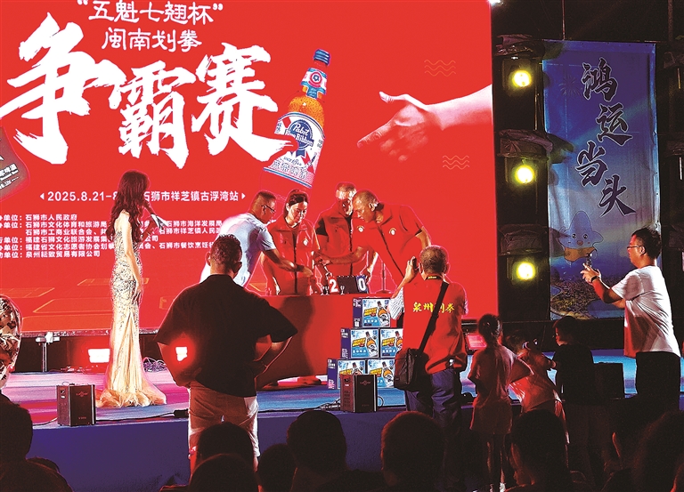 本报讯 8月21日,石狮市开海旅游消费季正式启动。当晚,一场融合海洋文化、美食体验与民俗竞技的“渔市鲜锋”美食直播市集狂欢节暨“五魁七翘杯”闽南划拳争霸赛在古浮湾海洋文化广场热烈开启。