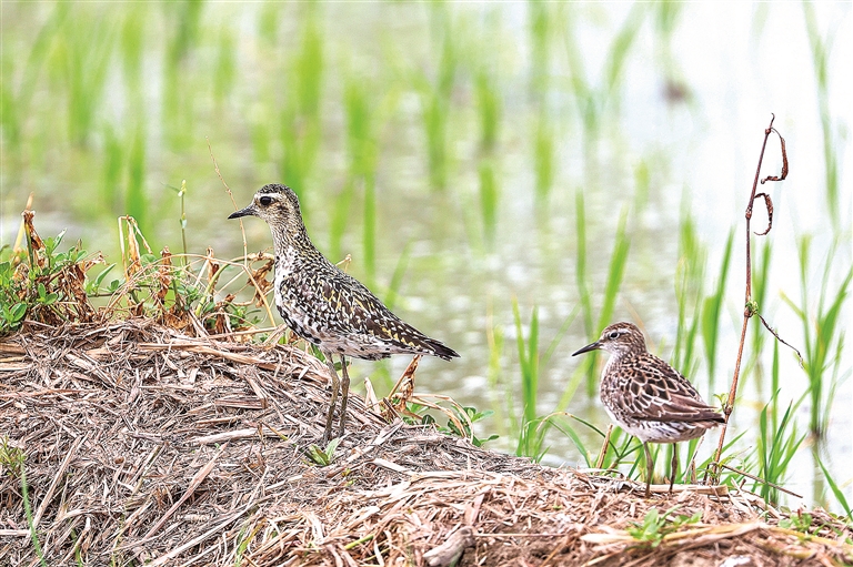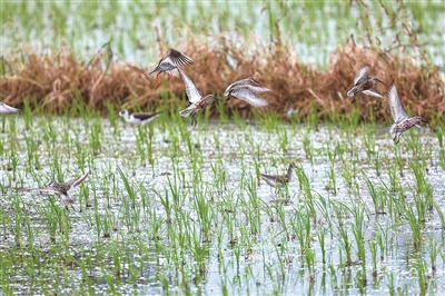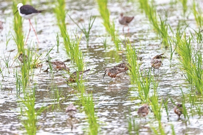 “鸻鹬类候鸟大约在8月上旬抵达泉州,今年到达时间与往年基本符合。”省野生动植物保护协会志愿者委员会主任委员、泉州市观鸟学会会长吴轲朝介绍说,候鸟南迁的影响,一方面是气候变化,另一方面是食物链驱使,石狮湿地公园内有宽广的稻田,刚刚种下的晚稻秧苗还不高,并且水田内食物多,恰好成为鸻鹬类候鸟“天然的食堂”。大批鸻鹬类候鸟迁徙到这里,暂作停歇、补充能量,为飞往更南的南方做准备。