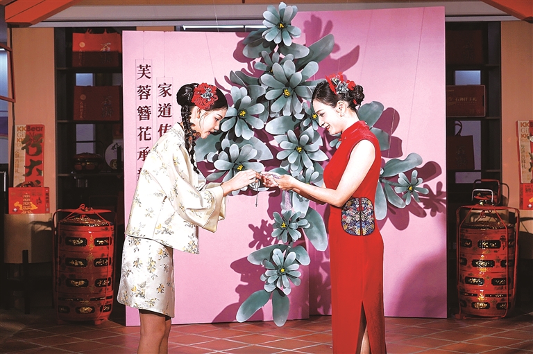 在“簪花承礼”仪式中,母亲为女儿亲手佩戴芙蓉菊发饰的瞬间,既寄托了对女儿成长的期盼,也承载着家族智慧的无声传递。在簪艺雅集、家风手札等环节,少女们通过亲手制作香囊耳环、书写家风寄语,进一步深化对“美与礼”的理解。活动中还开展祈愿花寻宝活动,将簪花习俗与八卦街本地文化结合,让母女在探访闽南家风节点的过程中,感受民俗礼仪与地域文化的交融之美。