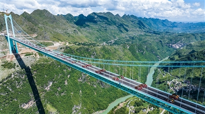 8月25日拍摄的贵州花江峡谷大桥荷载试验现场(无人机照片)。8月25日,在建世界第一高桥——贵州花江峡谷大桥荷载试验顺利完成,通车在即。在静力荷载试验过程中,96辆总重达3300吨的重型大货车分批驶上桥面,对大桥进行了一次全面而严格的“体能测验”。荷载试验顺利完成,标志着大桥通过了通车前的“关键大考”,有望于9月下旬宣布通车。花江峡谷大桥于2022年1月开工建设,是贵州六枝至安龙高速公路的控制性工程,全长2890米,主桥跨径1420米,桥面到水面高度625米。花江峡谷大桥建成后,主桥跨径将居山区桥梁跨径世界第一、桥梁高度将居世界第一。(新华)